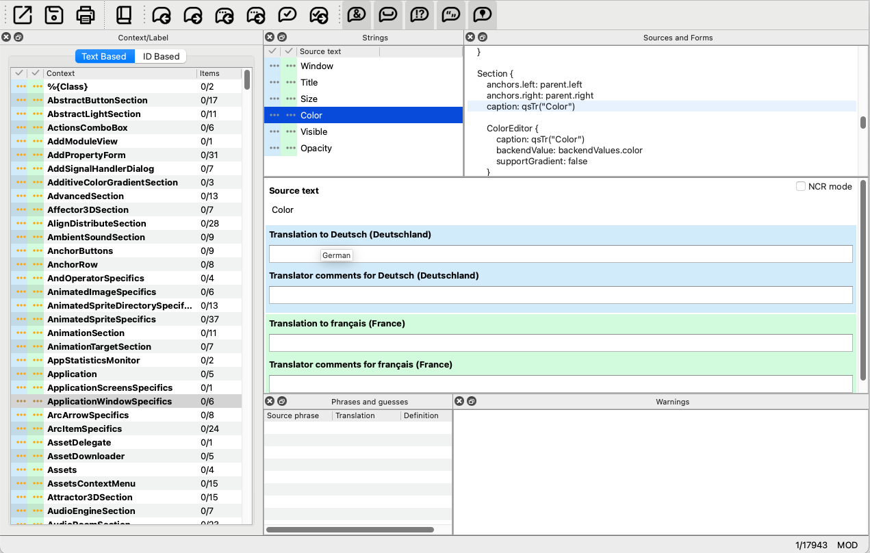 可以同时加载和编辑多个翻译文件。以下屏幕截图显示 德语 and 法语 加载翻译文件。