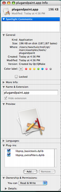 We can also add plugins extending Qt, for example adding SQL drivers or image formats. We just need to follow the directory structure outlined in plugin documentation, and make sure they are included in the QCoreApplication::libraryPaths (). Let's quickly do this with the image formats, following the procedure outlined earlier. 把 Qt 的图像格式插件拷贝到捆绑中: cp -R /path/to/Qt/plugins/imageformats pluginandpaint.app/Contents/plugins