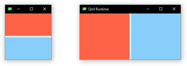 Rectangle { id: rectangle1 color: "tomato" Layout.fillHeight: true Layout.fillWidth: true } Rectangle { id: rectangle2 color: "lightskyblue" Layout.fillHeight: true Layout.fillWidth: true }