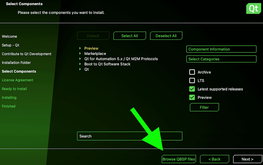 After this, the list of available components is updated. Under Boot to Qt Software Stack ,选择 Raspberry Pi and then 下一 . This will install the Boot to Qt system image and toolchain for Raspberry Pi.