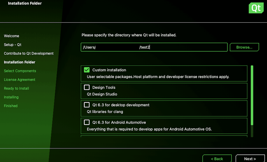 Maintenance tool allows you to modify your existing Qt installation. Navigate to Custom installation 并选择 下一 .