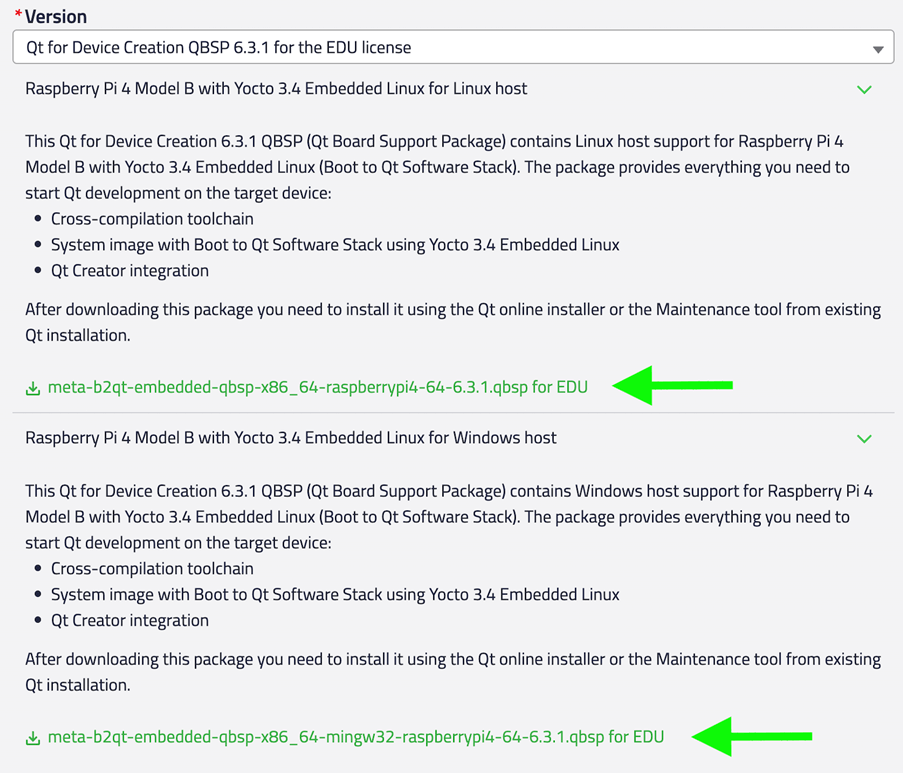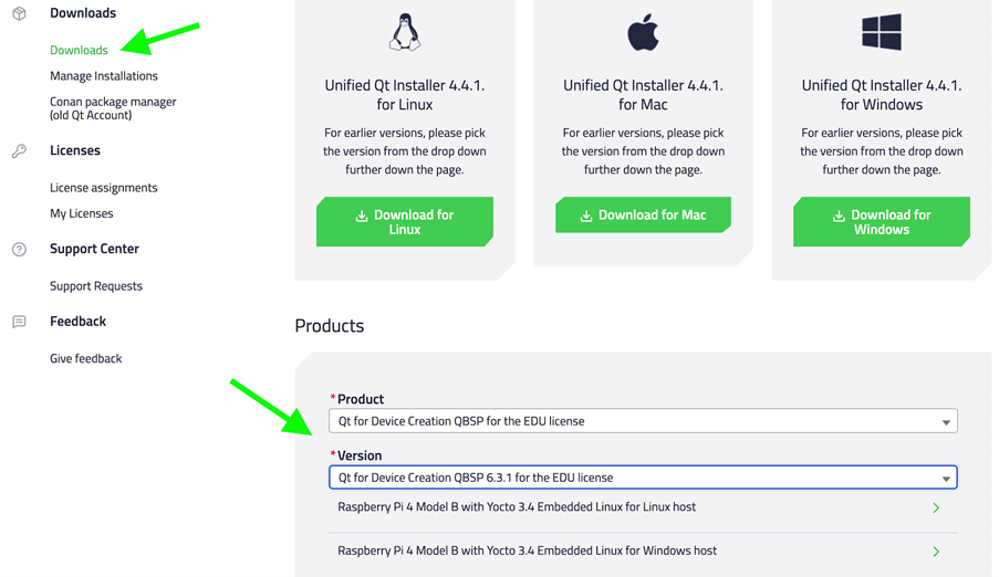 Log in to your Qt 帐户 . Go to the 下载 section and select Qt for Device Creation QBSP for the EDU license from the drop-down menu in the 产品 字段。