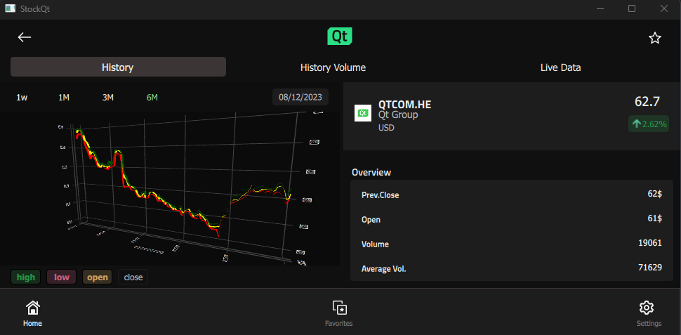 StockView and FavoriteView are complex data models that present a trend chart for the selected stock or a group of up to 5 stocks. They use another custom type, StockChart or FavoriteChart, which loads the data from the StockEngine into ListModels and presents the graphical trend of the stock price using a Surface3D , Bars3D ,或 Scatter3D .