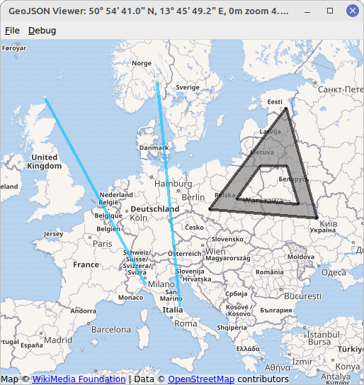 To draw a MapItem, right click on an empty part of the map and select an item type of your choice in the appearing menu. The next clicks will define the chosen item. The example allows to draw MapCircles , MapRectangles , MapPolygons and MapPolylines . Items that are fully defined by two points, i.e. circles and rectangles, are drawn with two clicks of the left mouse button. Items that are defined by multiple points, i.e. polygons and polylines, are created by an arbitrary amount of left button clicks and completed with the right mouse button. Items drawn this way are saved as points, polygons and polylines to fit the GeoJson specification, see https://geojson.org/ .