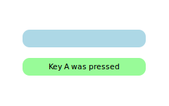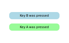 Rectangle { id: widget color: "lightsteelblue"; width: 175; height: 25; radius: 10; antialiasing: true Text { id: label; anchors.centerIn: parent} focus: true Keys.onPressed: (event)=> { if (event.key == Qt.Key_A) label.text = 'Key A was pressed' else if (event.key == Qt.Key_B) label.text = 'Key B was pressed' else if (event.key == Qt.Key_C) label.text = 'Key C was pressed' } }