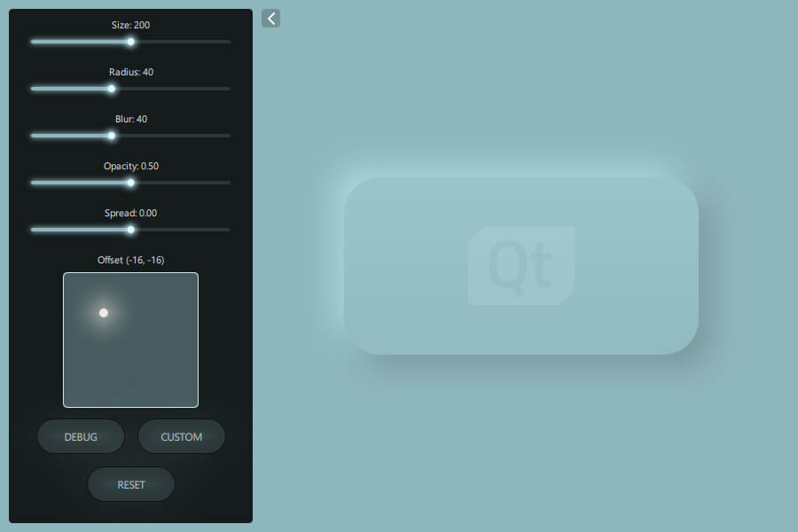 此范例演示 RectangularShadow type, which offers an efficient solution for applying rounded rectangle shadows and glows. The API of the RectangularShadow matches to CSS box-shadow element, with some additions.