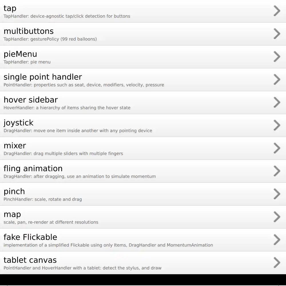 The "tablet canvas" page uses PointHandler to uniquely detect different types of pointing devices , so that if you have a drawing tablet connected to your computer, you can draw on the Canvas item with different types of stylus: pen, airbrush or marker. You can "erase" strokes with the stylus eraser (done here by drawing on top with the background color). Several HoverHandlers provide feedback about which type of stylus or eraser is detected.