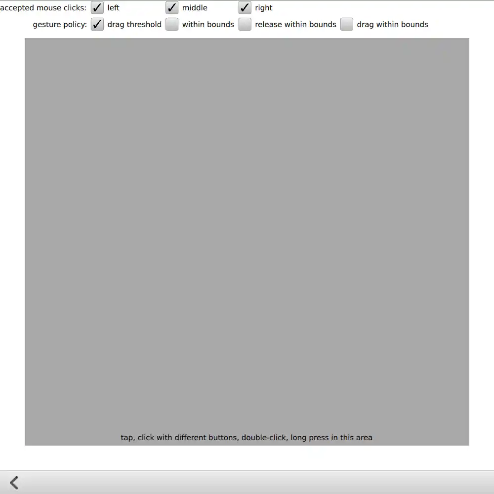 The "tap" page shows how to detect touchscreen taps, long-presses, and mouse clicks with different buttons. You can also try out the different gesturePolicy 值。