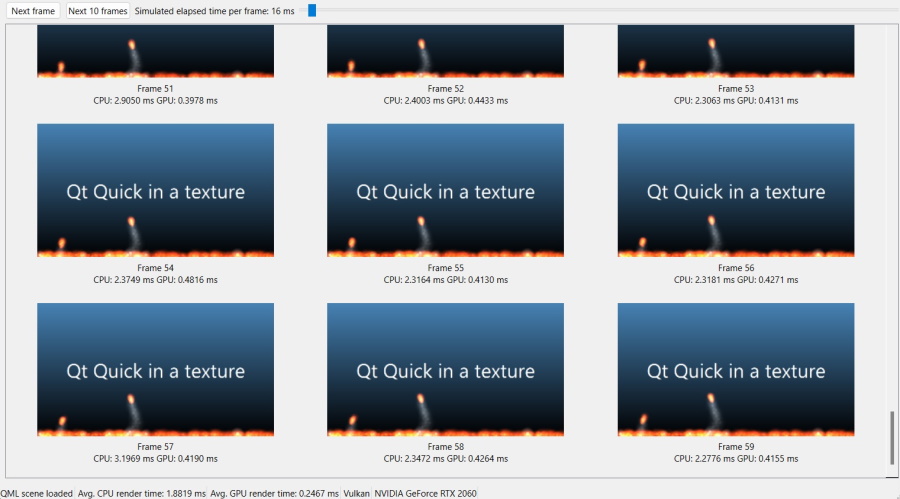 The example also demonstrates a simple way of measuring the cost of rendering a frame on the CPU and the GPU. Offscreen-rendered frames are well suited for this due to certain internal QRhi behavior, which implies that operations that otherwise are asynchronous (in the sense that they complete only when rendering a subsequent frame), are guaranteed to be ready once QRhi::endOffscreenFrame () (i.e., QQuickRenderControl::endFrame ()) returns. We use this knowledge when reading back the texture, and it applies also to GPU timestamps as well. That is why the application can display the GPU time for each frame, while guaranteeing that the time actually refers to that particular frame (not an earlier one). See lastCompletedGpuTime () for details around GPU timings. The CPU side timings are taken using QElapsedTimer .