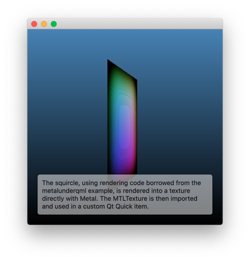 The Metal Texture Import example shows how an application can import and use a MTLTexture in the Qt Quick scene. This provides an alternative to the underlay or overlay approaches when it comes to integrating native Metal rendering. In many cases going through a texture, and therefore "flattening" the 3D contents first, is the best option to integrate and mix custom 3D contents with the 2D UI elements provided by Qt Quick.