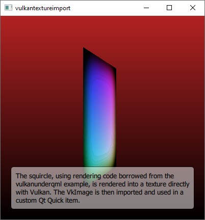 The Vulkan Texture Import example shows how an application can import and use a VkImage in the Qt Quick scene. This provides an alternative to the underlay or overlay approaches when it comes to integrating native Vulkan rendering.