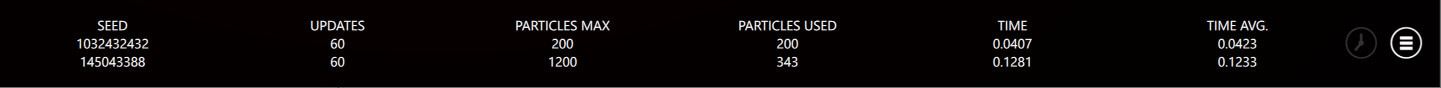 Bottom-right corner of each example contain an icon that opens the logging view. From this view, you can see different debug data about the particles. Each ParticleSystem3D has its own row showing its ParticleSystem3DLogging 数据。