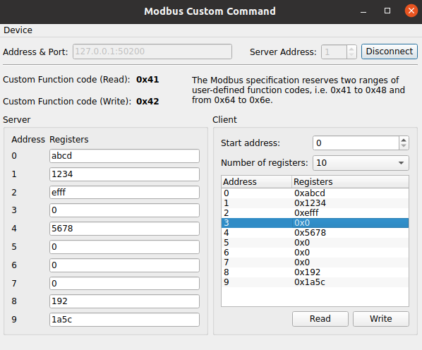 The main purpose of the example is to provide some demo code on how to implement a Modbus client or Modbus server handling custom Modbus function codes.