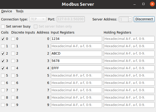 After the server is created and all the parameters are specified, use QModbusServer::connectDevice () to connect to Modbus network.