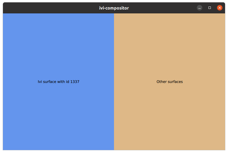 WaylandOutput { sizeFollowsWindow: true window: Window { width: 1024 height: 768 visible: true Rectangle { id: leftArea width: parent.width / 2 height: parent.height anchors.left: parent.left color: "cornflowerblue" Text { anchors.centerIn: parent text: "Ivi surface with id 1337" } } Rectangle { id: rightArea width: parent.width / 2 height: parent.height anchors.right: parent.right color: "burlywood" Text { anchors.centerIn: parent text: "Other surfaces" } } } }