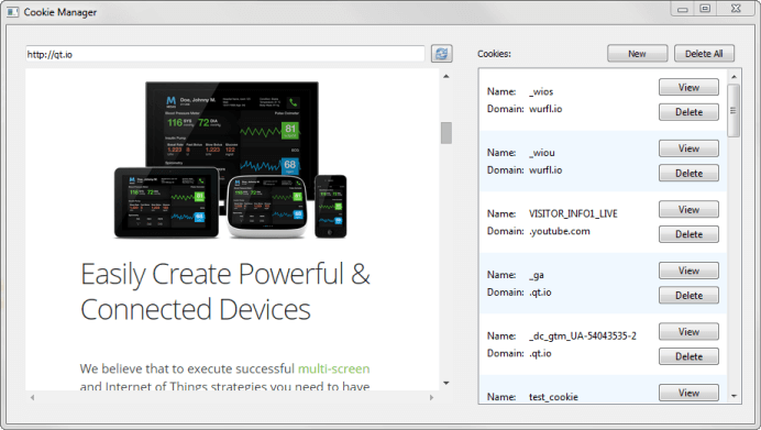 Cookie Browser 演示如何使用 Qt WebEngine C++ 类 去管理 Cookie。浏览器可以用于查看 Cookie 内容及删除 Cookie 和添加新 Cookie。