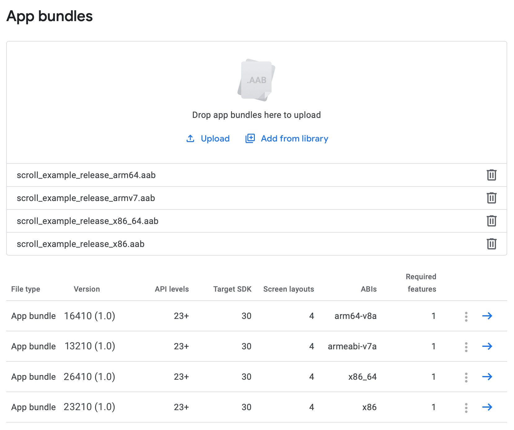 The following screenshot shows an example of an app targeting 4 ABIs, while each package uses a unique version code, which is different from the version name that is the public version string.
