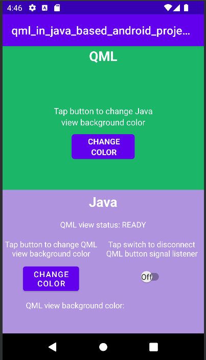 signal is emitted every time the button on the QML component is clicked. That signal is then received by this listener and the background color of the layout holding the Android side of the application is set to a random color value fetched from the