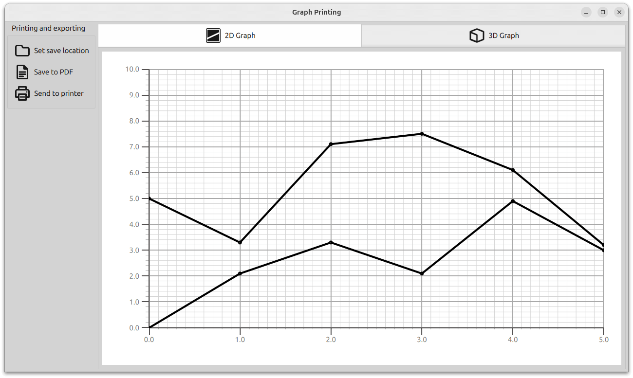 The Graph Printing example demonstrates how to print or export to PDF 2D and 3D graphs.