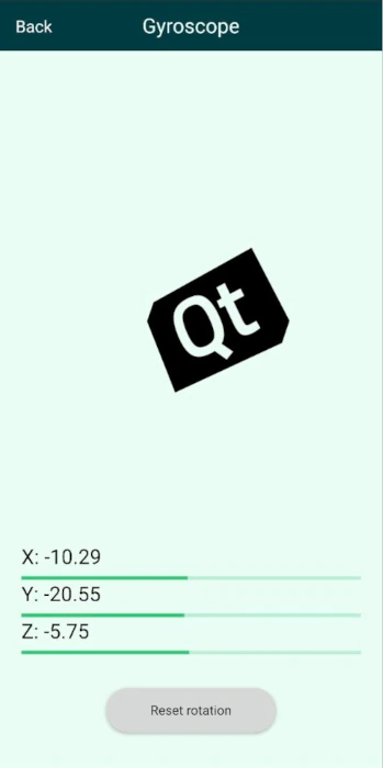 Gyroscope { id: gyroscope property var lastTimeStamp: 0 property real x: 0 property real y: 0 property real z: 0 active: true dataRate: 25 onReadingChanged: { x = (reading as GyroscopeReading).x y = (reading as GyroscopeReading).y z = (reading as GyroscopeReading).z let firstCall = false if (lastTimeStamp == 0) { firstCall = true } let timeSinceLast = reading.timestamp - lastTimeStamp lastTimeStamp = reading.timestamp //Skipping the initial time jump from 0 if (firstCall === true) return let normalizedX = x * (timeSinceLast / 1000000) imageXRotation.angle += normalizedX let normalizedY = y * (timeSinceLast / 1000000) imageYRotation.angle -= normalizedY let normalizedZ = z * (timeSinceLast / 1000000) imageZRotation.angle += normalizedZ } }