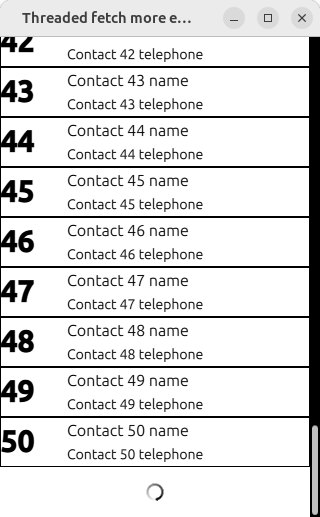to the ThreadedFetchMoreModel::dataReceived() slot, which appends them to the data list in the UI thread. The UI thread adds a placeholder item to the end of the list before sending the fetchDataBlock() signal to the worker object to kick off the fetching process, and removes the placeholder before appending new items to the list.